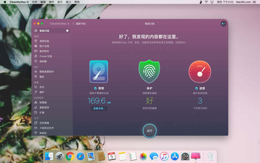 一键智能化清理是对您的Mac进行一站式清理,自动扫描Mac上的所有文件, 包括:Mac系统清理、邮件应用程序清理、大&旧型文件清理、 itunes文件清理、废纸篓清理等,人们只需要操作三个步骤:打开CleanMyMac—扫描—清理,完成mac智能化清理!